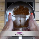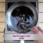 12. Add melted jaggery little by little, about two tablespoons at a time and knead.