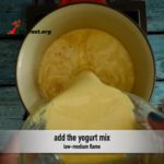 1. Add all ingredients except oil and masala paste (yogurt, water, asafoetida, turmeric, salt, chilli powder, bengal gram flour) to the same vessel which you used for making dough. This way, any dough sticking to the vessel will also get mixed with yogurt and will add thickness to the gravy once you boil it.