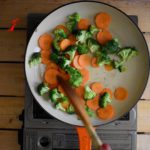 Add oil to a Pan. Add Carrots and Broccoli and saute for 2 minutes.